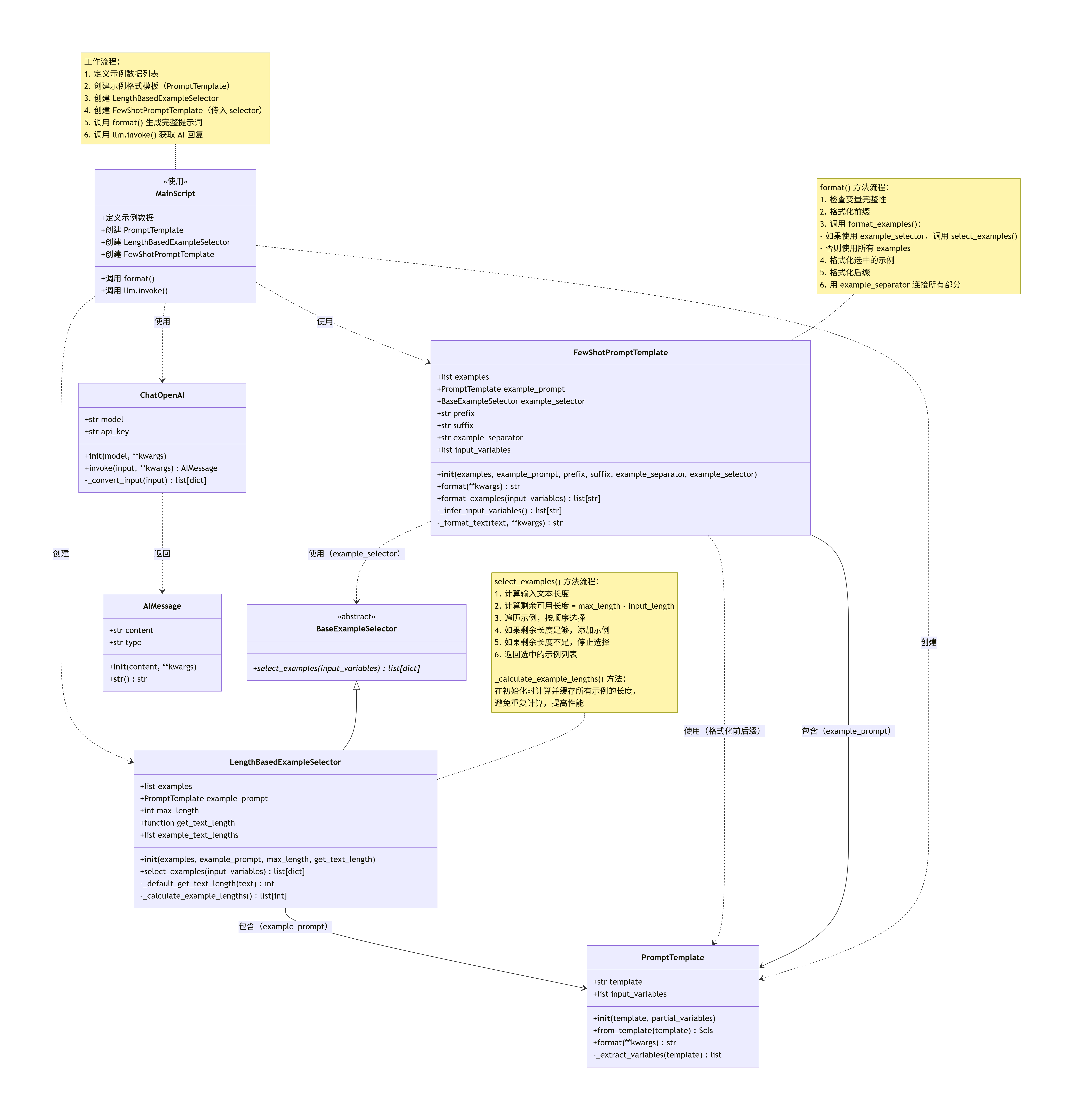 LengthBasedExampleSelector 就是为了解决上述问题设计的自动示例选择器。其核心逻辑如下: